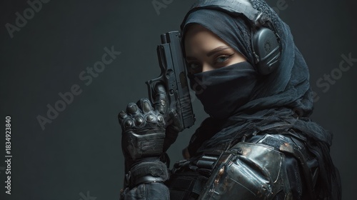 woman, female, gun, handgun, weapon, tactical, gear, military, combat, security, defense, protection, black, dark, studio, portrait, face, veil, headscarf, attire, clothing, serious, strong, powerful, confident, prepared, action, isolated, profile, sharpened, eye, looking, posing, professional, alert, vigilant, concept, illustration, design, copy space, silhouette, digital, modern, background
