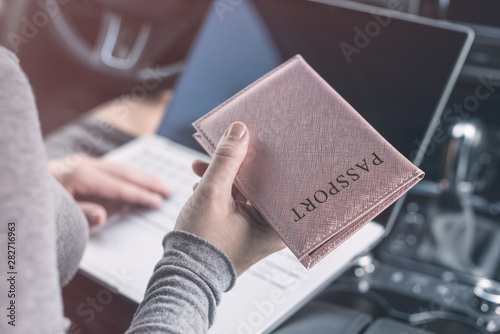 Woman in the car with laptop and passport in a pink cover. Travel concept.