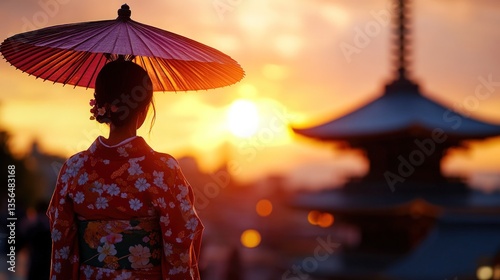 Woman in traditional Japanese kimono at sunset, pagoda background