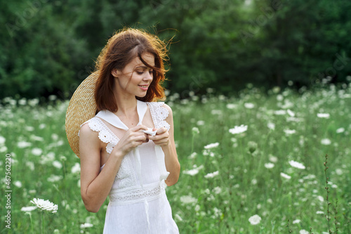 Woman in white dress in a field walk flowers vintage nature