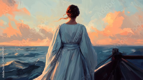woman, dress, ocean, sunset, wave, sky, cloud, silhouette, nature, beauty, freedom, calmness, horizon, scenery, water, travel, adventure, dream, fantasy, art, peaceful, journey, femininity, elegance, emotion, solitude, calm, picturesque, light, colours, creative, landscape, surreal, marin, vintage, romantic, aethereal, watercolor, atmosphere, inspiration, hope, exploration, environment