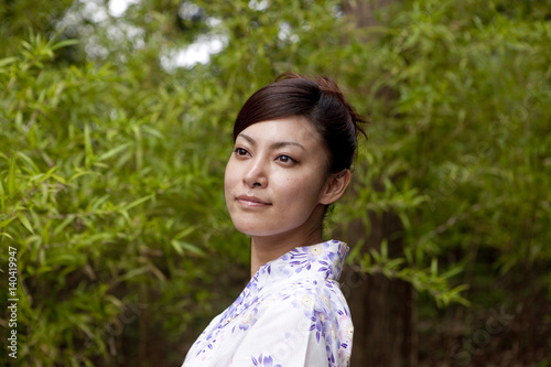 japanese, woman, photo, color image, outdoors, day, horizontal, one person, japanese ethnicity, 20s, half face, yukata, traditional culture, japanese culture, bamboo, formal garden, lifestyle, selective focus, japan