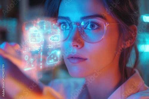 hologram, interface, woman, goggles, neon light, science, technology, innovation, digital, futuristic, interaction, artificial intelligence, network, connectivity, software, application, programmer, developer, science fiction, graphic, design, system