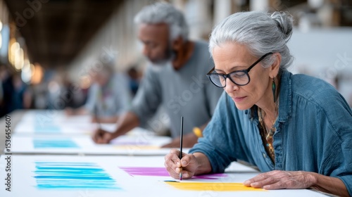 woman, painting, brush, wearing, goggles, ponytail, person, adult, senior, retired, horizontal, indoor, female, art, elderly, caucasian, hobby, artistic, day, mature, lifestyle, young, creativity, home, painter, leisure, class, studio, school, old, assistance, photo, sitting, education, two people, creation, technology, aged, laptop, table, lesson, picture, togetherness, student, easel, communication, drawing, signature, talking