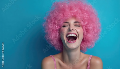 woman, laughing, wig, pink, curly, blue, background, smiling, happy, portrait, face, expression, joy, fun, indoor, studio, fashion, lifestyle, beauty, make-up, eye, looking, head, hair, person, closeup, bright, colours, vibrant, positive, youthful, cheerfulness, entertainment, posing, model, studio shot, isolated