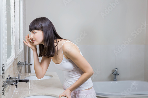 people, woman, skincare, mirror, bathroom, marble, vanity, beauty, relaxation, elegance, luxury, copy space, minimalist, interior, adult, female, touching, eye, sink, bathtub, chrome, faucet, tiled, wall, natural light, soft light, residential, pale, neutral, white, pajama, short, rectangular, alcove, countertop, home, single, casual attire, hygiene, cosmetic, morning, grooming, indoor, clean