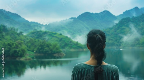 woman, looking, lake, adult, adventure, asian, back, background, beautiful, blue, space, person, countryside, traveler, young, holiday maker, trip, people, travel, sunset, lifestyle, girl, park, journey, rear, nature, mountain, view, fresh, sky, natural, tree, scenery, season, greenery, female, explorer, water, forest, vacation, ocean, river, outdoors, holiday, destination, green, landscape