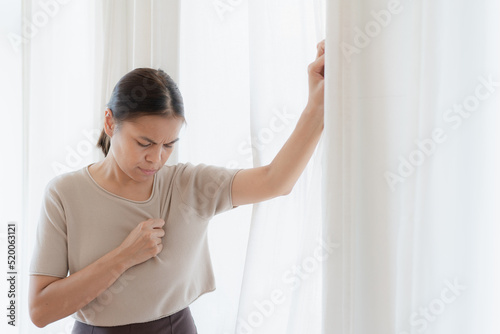 woman looking out window , The women has heart disease and go to hospital urgent. People with heart problem concept