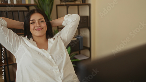 woman, office, indoor, workplace, curvy, young, relaxed, business, shelf, plant, interior, desk, casual attire, professional, smiling, happy, modern, workspace, person, fashion, shirt, relaxation, female, employee, corporate, calm, confident, elegant, easygoing, portrait, businesswoman, job, management, staff, work, career, occupation, furniture, background, smile, expression, well-being, health, emotion, computer, technology