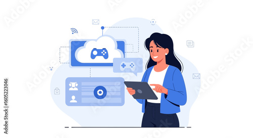 online, gaming, cloud, service, tablet, woman, interface, vector, illustration, concept, console, network, technology, digital, communication, modern, cyberspace, platform, application, entertainment, leisure, virtual, interactive, connection, play, user, profile, device, wireless, system, software, information, creative, design, graphic, element, cartoon, style, cheerful, content, professional, manager