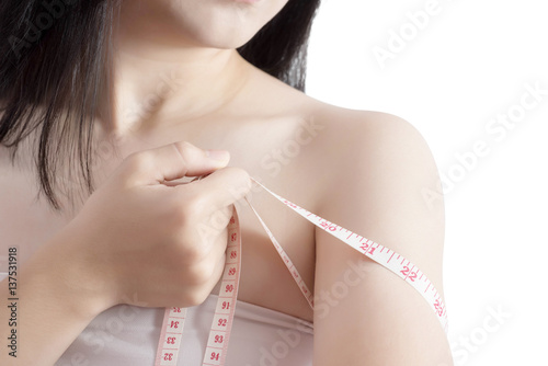 Woman measuring obese isolated on white background. Clipping path on white background.
