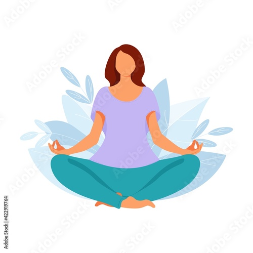 Woman meditate in yoga pose. Person doing meditation for relax and health. Vector