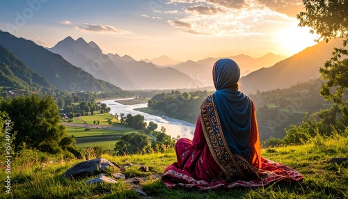 woman, meditation, sunset, mountain, vale, river, nature, peaceful, serene, dress, sitting, outdoors, view, travel, landscape, scenic, sunrise, colours, light, gold, horizon, calm, tranquil, spiritual, traditional, clothing, grass, hill, faraway, rural, beauty, green, evening, dramatic, peace, woman, location, tour tourism
