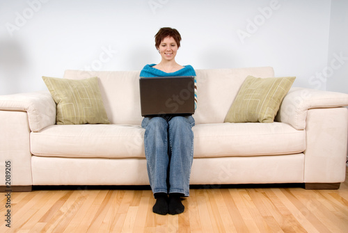 woman, girl, female, laptop, computer, happy, leisure, enjoy, enjoyment, casual clothes, casual attire, sexy, beautiful, attractive, cute, couch, sofa, living room, house, home, cyberspace, wireless, technology, work, notebook