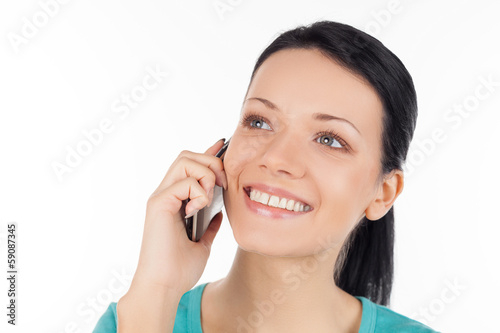 woman, isolated, white, beautiful, attractive, female, young adult, 20s, black hair, caucasian, casual attire, studio shot, standing, lifestyle, human hand, looking, smiling, toothy smile, happiness, facial expression, horizontal, excitement, enjoyment, cheerful, confidence, holding, phone, mobile phone, talking, communication