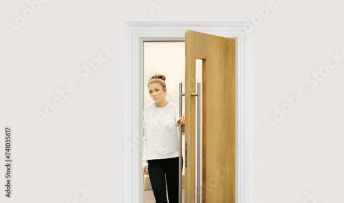 attractive, beautiful, building, bye, caucasian, closing, coming, dating, decoration, door, door handle, entering, entrance, entry, family, female, front, garden, girl, adieu, home, house, homemaker, inviting, lawn, leaves, living, looking, meeting, modern, open, people, safety, standing, visit, waiting, welcome, wife, woman, wooden