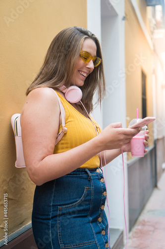 technology, music, girl, woman, happy, vacation, holiday, summer, young, joy, yellow, pink, short, caucasian, brunette, earphones, fashionable, casual attire, picture, female, smiling, blond, earphones, fashion, city, street, person, 1, elegant, beauty, lady, urban, blond, smile, drink, cute, alone, wall, lifestyle, beautiful, style, attractive, adult, model, photo, pretty, outfit, portrait, outside