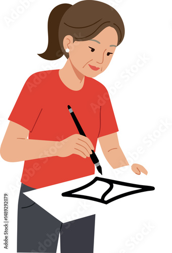 woman, person, female, artist, painter, brush, painting, paper, red, shirt, grey, pant, hair, ponytail, hand, art, creativity, hobby, leisure, drawing, colours, casual attire, clothing, design, expression, activity, gesture, style, vector, illustration, craft, work, avocation, creative, paint, skill, talent, canvas, indoor, isolated, simple, flat, modern, young, artistic