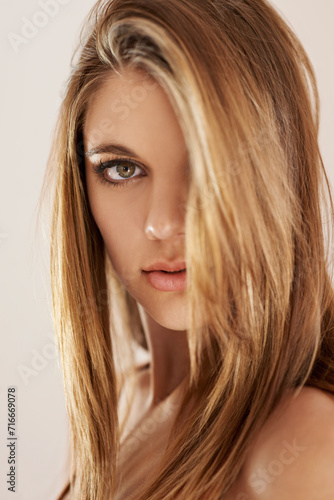 Woman, portrait and makeup beauty with confidence for cosmetic style for wellness glow, shine or health. Female person, face and model at studio background for self care pride, hair or grooming