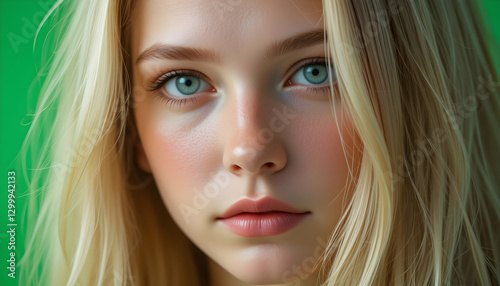 woman, portrait, looking, closeup, facial, blond, hair, blue, eye, face, skin, young, person, caucasian, female, human, head, straight, green, background, studio, fair, complexion, light, colours, contact, cosmetic, beauty, model, style, fashion, aesthetic, glamour, youth, artistic, digital, image, generation