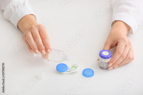 Woman pouring solution in container with contact lenses on white background