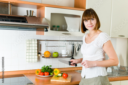 cooking, diet, woman, kitchen, brunette, domestic, knife, lifestyle, vegetable, young, tied-up, caucasian, dieting, eating, food, foodstuff, gastronomy, epicure, healthy, life, lunch, preparing, salad, scene, smiling, talking, tomatoes, vegetarian, wife