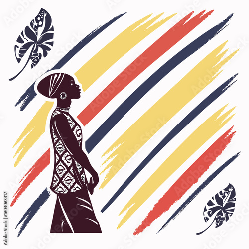 profile, silhouette, earring, abstract, colourful, stripes, red, yellow, blue, graphic, illustration, pattern, cultural, design, modern, bold, artistic, decorative, ethnic, isolated