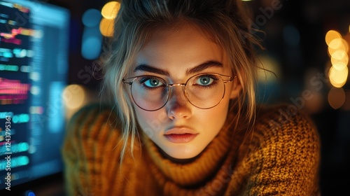 programmer, woman, coding, night, city, bokeh, technology, girl, computer, code, software, developer, screen, female, office, work, digital, datum, cyberspace, laptop, business, future, innovation, network, cyber, web, design, artificial, intelligence, modern, creative, elegant, stylish, sharpened, serious, professional, portrait, young, attractive, beautiful, model, studio, light, glow