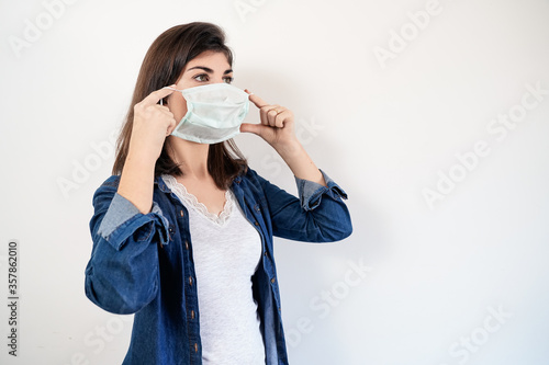 woman, face mask, putting, medicals, virus, white background, portrait, girl, white, protection, protective, mask, wearing, flu, health, sick, adult, isolated, disease, female, care, medicals, face, medicine, beautiful, young, wear, space, lady, background, person, safety, quarantine, prevention, air