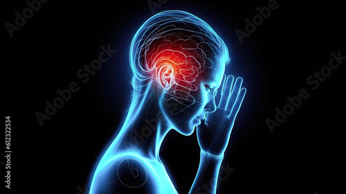 Woman ray suffering from a headache against a dark background. Generative AI.