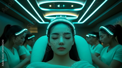 beauty, futuristic, technology, treatment, spa, skincare, salon, clinic, wellness, light, therapy, led, medicals, cosmetic, aesthetic, rejuvenation, relaxation, serenity, calm, peaceful, healthy, glow, skin, face, eye, closed, woman, female, girl, people, human, person, young, adult, modern, elegant, sophisticated, innovative, advanced, science, future, progress, energy, vibrant, bright