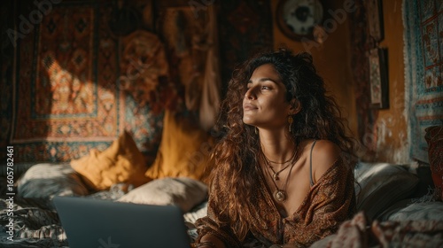 Woman reflecting in cozy room with laptop bohemian decor intimate atmosphere warm lighting personal growth