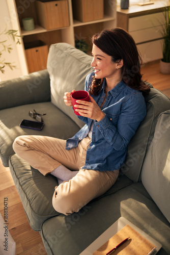woman, relaxing, home, hot drink, mug, sofa, smiling, drinking, leisure, comfort, happiness, lifestyle, casual attire, indoor, domestic, adult, female, youth, apartment, living room, modern, cosy, bright, pleasant, weekend, break, pause, wellness, well-being, peace, peaceful, content, enjoyment, routine, daily, day, beautiful, attractive, thoughtful, contemplation, looking away, half face, tranquil, quiet