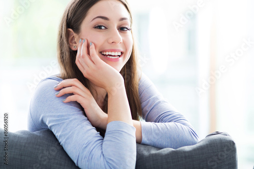 domestic, casual attire, home, indoor, apartment, house, woman, female, people, young, young adult, caucasian, one person, happy, smiling, smile, happiness, enjoying, joy, day, beautiful, attractive, leisure, domestic life, confidence, couch, sofa, relax, relaxing, living room
