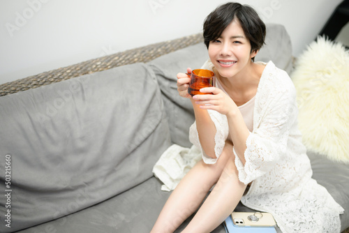 female, relaxing, comfortable, tea, cup, hot drink, one person, people, 20s, 30s, calf, smiling, home, holiday, copy space, sofa, couch, japanese, asian, full-length, drinking, room, young, sitting, living, indoor, indoor, cute, bright, portrait, lifestyle, autonomic, stress, healthy, rest, resting, beautiful, beautiful woman, glasses, gazing, looking, she, date, overhead