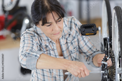 woman repairs a bike wheel