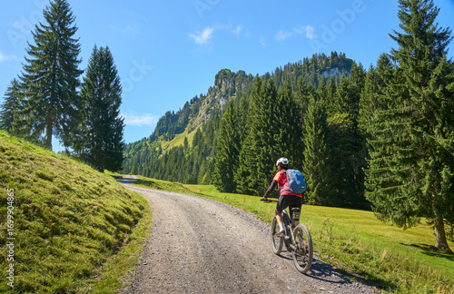 woman riding her electric mountain bike in the Bregenz Forest Mountains near near village of Au, Vorarlberg, Austria
