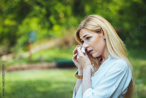 Woman rubbing her eye outdoors. Chronic Disease Control, Allergy Induced Asthma Remedy And Chronic Pulmonary Disease Concept. Attractive Woman Outdoors is Having Allergy