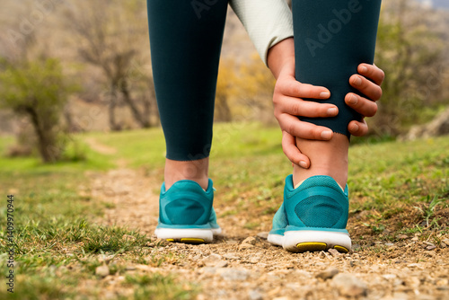 Woman runner holding ankle in pain after possible injury during outdoor run on nature trail, sports injury, leg pain, hiking accident, active lifestyle, outdoor running, fitness health, close-up