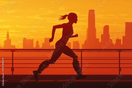 Woman Running at Sunset with Futuristic Prosthetic Legs in City