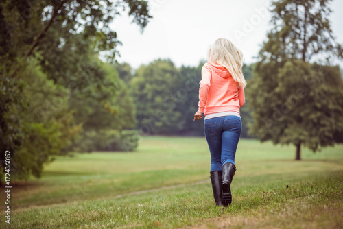 Woman running from camera across meadow wearing coral hoodie, blue jeans and black rubber boots