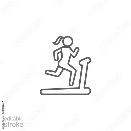 Woman running on treadmill icon. Simple outline style. Run, female, gym equipment, fitness, exercise machine, sport concept. Thin line symbol. Vector isolated on white background. Editable stroke SVG.