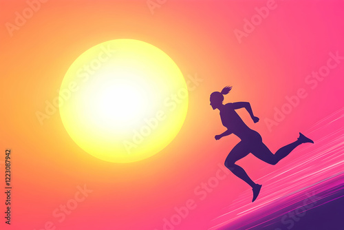 Woman running towards a vibrant sunset, embracing the energy of the moment and the beauty of nature
