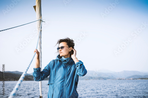 sailing, yacht, sea, woman, blue, missy, summer, luxury, vacation, holiday, leisure, marin, nautical, ocean, yachting, daylight, ship, ahoy, brunette, anorak, sunglasses, looking away, landscape, scenic, windy, mediterranean, sailboat, water sport
