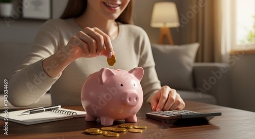 woman, saving, money, money box, coin, finance, budgeting, savings, investment, retirement, future, planning, goal, economy, wealth, home, indoor, calculating machine, desk, table, notebook, happy, smiling, positive, lifestyle, adult, female, closeup, hand, wooden table, comfortable, contentment, personal finance