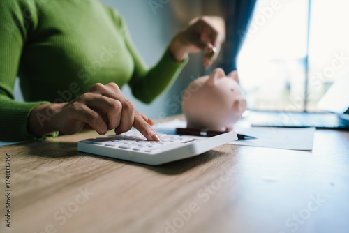Woman saving money by putting a coin into a pink piggy bank on a desk with financial charts, symbolizing personal finance and financial planning.