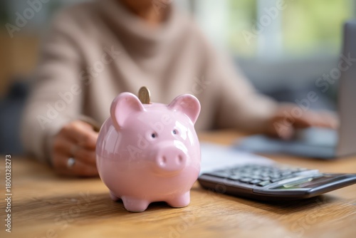 woman, saving, money, pink, baby pig, bank, desk, calculating machine, laptop, financial, planning, investment, finance, budget, economy, savings, coin, deposit, future, goal, growth, strategy, female, adult, business, office, home, computer, technology, security, wealth, management, success, fund, retirement, insurance, tax, personal
