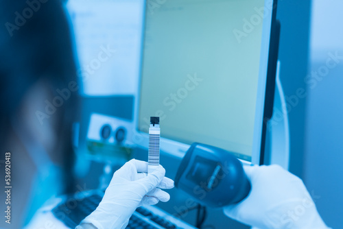 Woman scientist hand holding test tube barcode and scanner for automatic analysis machine in laboratory.Biologist working in modern laboratory with technological equipment.