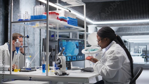 woman, scientist, modern, laboratory, pathology, investigation, molecular, analysis, biochemistry, research, innovation, diagnostic, biotechnology, petri, dish, sample, tissue, compound, element, deoxyribonucleic acid, matter, experiment, growth, observation, magnifying glass, inspection, cellular, testing, experimental, science, chemistry, biology, medicine, genetic, datum, discovery, health care, technology, laboratory, researcher, microbiology, african american