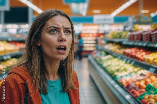 supermarket, shock, market, crisis, woman, stress, consumerism, retail, shopping, indoor, state of emergency, shop, selection, high, expression, concept, background, grocery, buy, buyer, disbelief, portrait, food, store, inflation, adult, female, price, mall, indoor, holding, purchase, sell, shopper, people, looking, necessity, recession, global, frustration, expense, confusion, finance, client, grocery, buying, forget, sale
